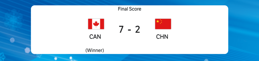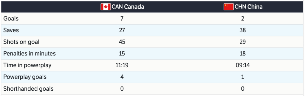Canada vs China. Feels like they just played. Canada came in second in Group A. They finished the group stage with a record of 2-1-0. China came in last in Group A. They finished the group stage with a record of 0-3-0. Canada defeated China 5-0 in the group stage. That game was the last game both teams played and the last game in the group stage for both teams. Canada opened up the scoring 6 minutes into the game. Canada would have a 2-1 lead after the first period. Canada would expand their lead to 5-2 after two periods. In the third period Canada scored twice to further expand their lead. The final score was 7-2 Canada.