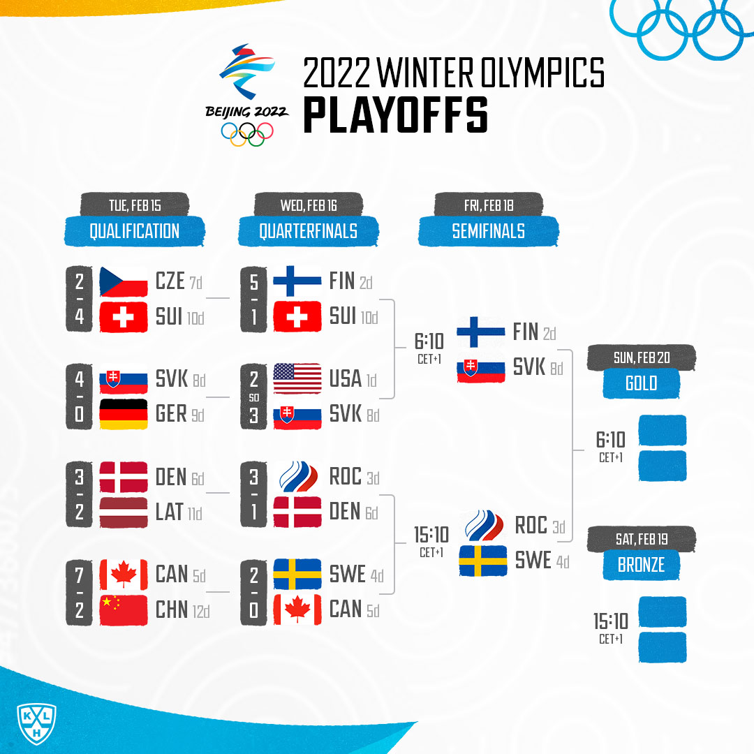 2022 Olympic Men’s Ice Hockey. We are now on day seven of the tournament. There were 4 games in the Men’s tournament. All the games were Quarterfinals games. The United States played Slovakia. ROC (Russia) played Denmark. Finland played Switzerland. Sweden played Canada. The winners would advance to the Semifinals. The losers would be eliminated.