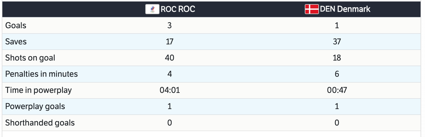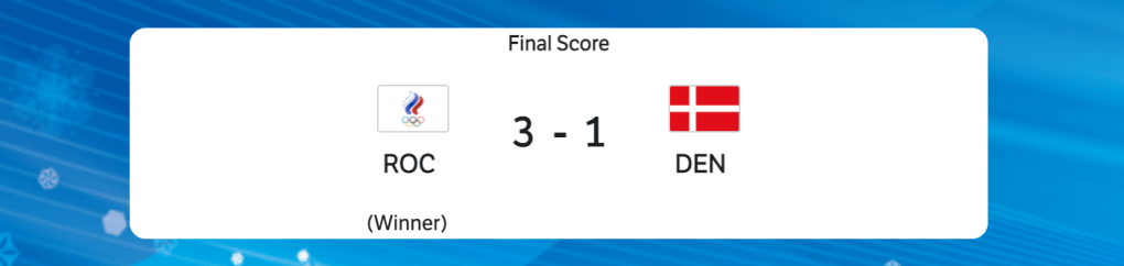 ROC (Russia) vs Denmark. ROC (Russia) had a 1-0 lead after the first period. ROC (Russia) would take a 2-1 lead after two periods. The final score was 3-1 ROC (Russia).