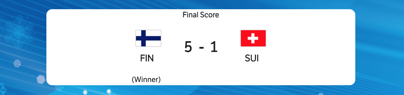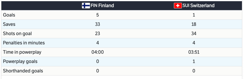 Finland vs Switzerland. Finland scored first. Finland had a 2-0 lead after the first period. Switzerland got one back in the second period. Finland had a 3-1 lead after the second period. Finland would score two more in the third period. The final score was 5-1 Finland.