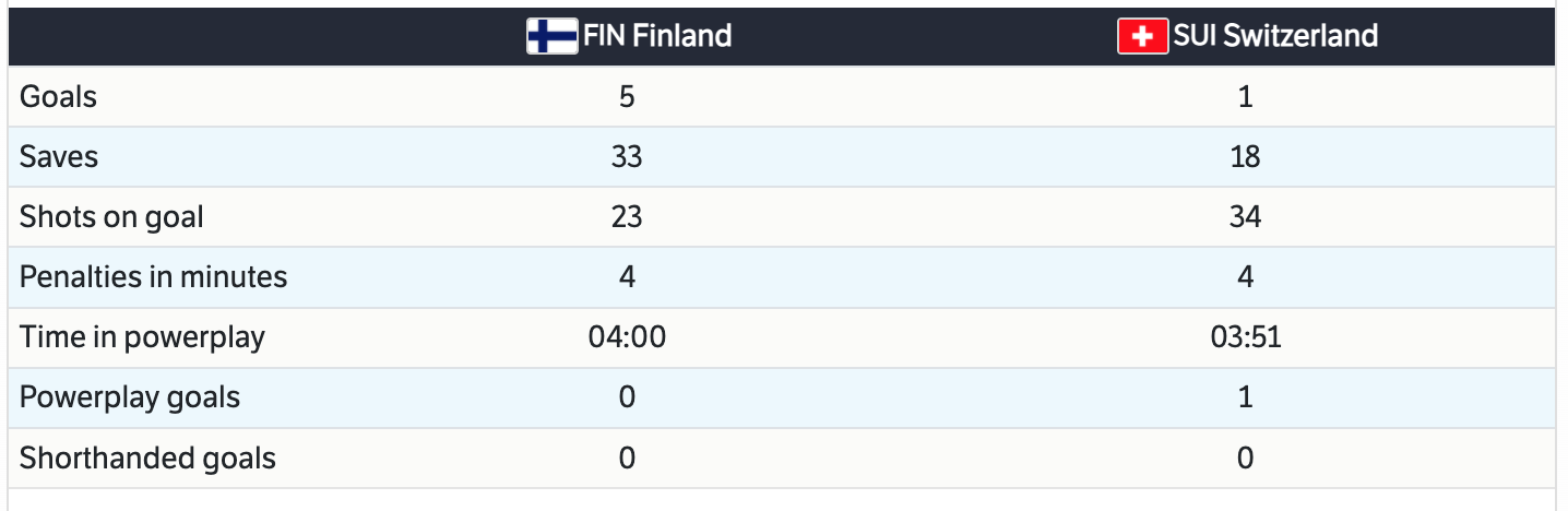 Finland has eliminated Switzerland. Finland will move on to the Semifinals. Finland now has a chance to medal. Finland was in control of the game despite being outshot. Finland rolls through Switzerland and onto the Semifinals.
