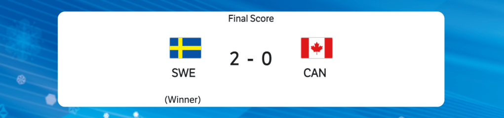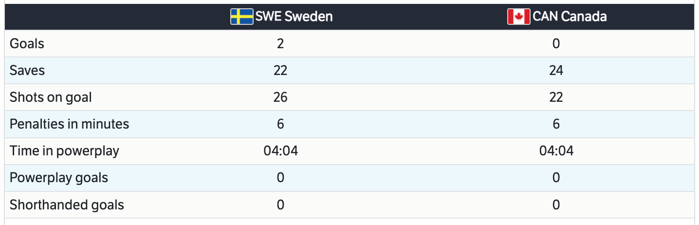 Sweden vs Canada. The score was 0-0 after the first period. Both sides had chances to score on the powerplay. The score stayed 0-0 after the second period. Both teams had two powerplays that they failed to score on in the second period. Sweden took the lead 10 minutes into the third period. Canada pulled their goalie. Sweden scored on the empty net. The final score was 2-0 Sweden.