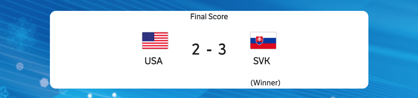 Neither team scored in overtime. The game went into a shootout. Slovakia scored the only goal of the shootout. The final score was 2-3 Slovakia.