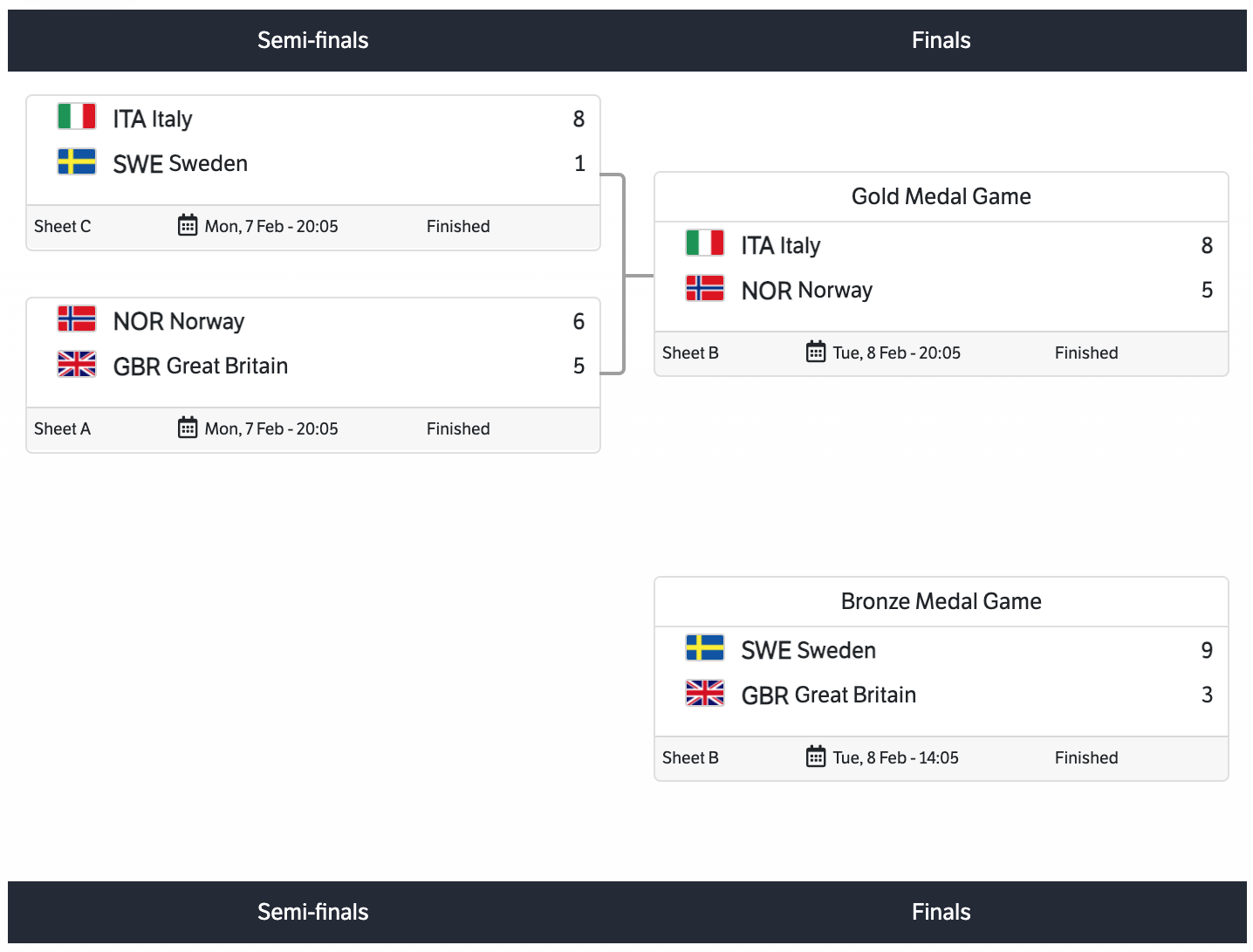 In Mixed Doubles, Italy won gold. Norway won silver. Sweden won bronze. USA came in 8th.