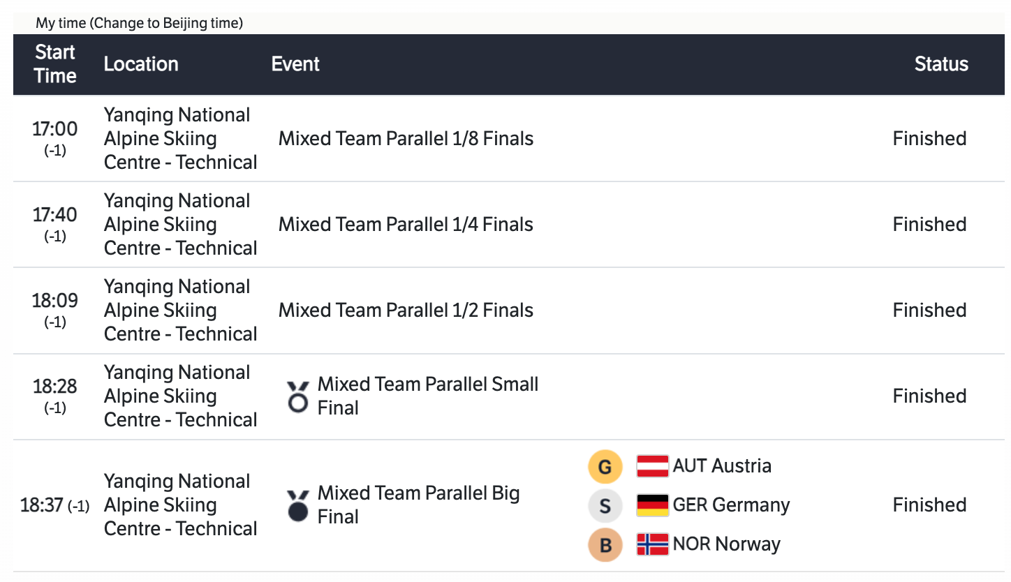 Alpine Skiing. In Alpine Skiing there was the Mixed Team Parallel. Austria won gold. Germany won silver. Norway won bronze. The United States Finished 4th. With that Alpine Skiing is done at the 2022 Olympics.