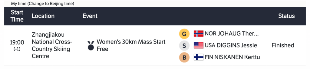 Cross-Country Skiing. In Cross-Country Skiing there was the Women’s 30km Mass Start Free. Norways Therese Johaug won gold. The United States Jessie Diggins won silver. Finlands Kerttu Niskanen won bronze. The United states also came in 6th, 15th and 18th. With that Cross-Country skiing comes to an end at the 2022 Olympics.