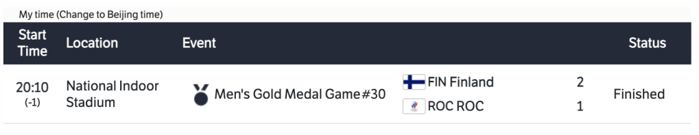 Ice Hockey. The final hockey game of the 2022 Olympics. The Men’s gold medal game. Finland played ROC (Russia). Finland beat ROC (Russia) to win their first ever gold medal in Ice Hockey. I will do an in depth blog post about that later. Ice Hockey is now over at the 2022 Olympics.