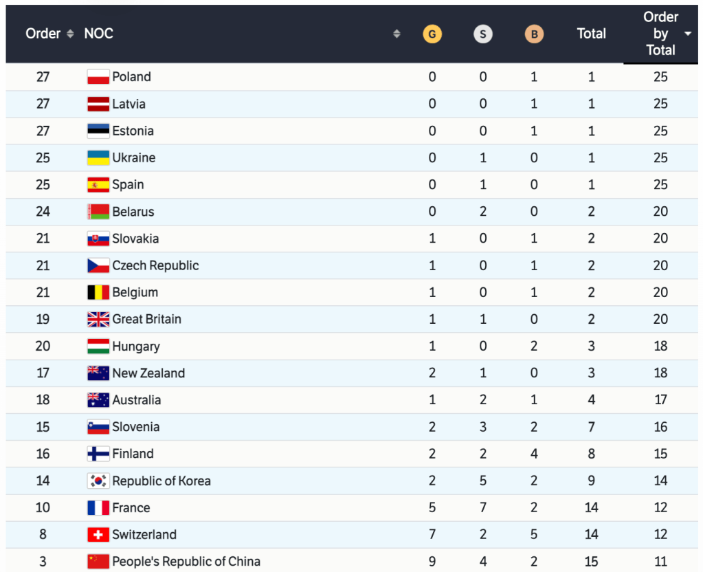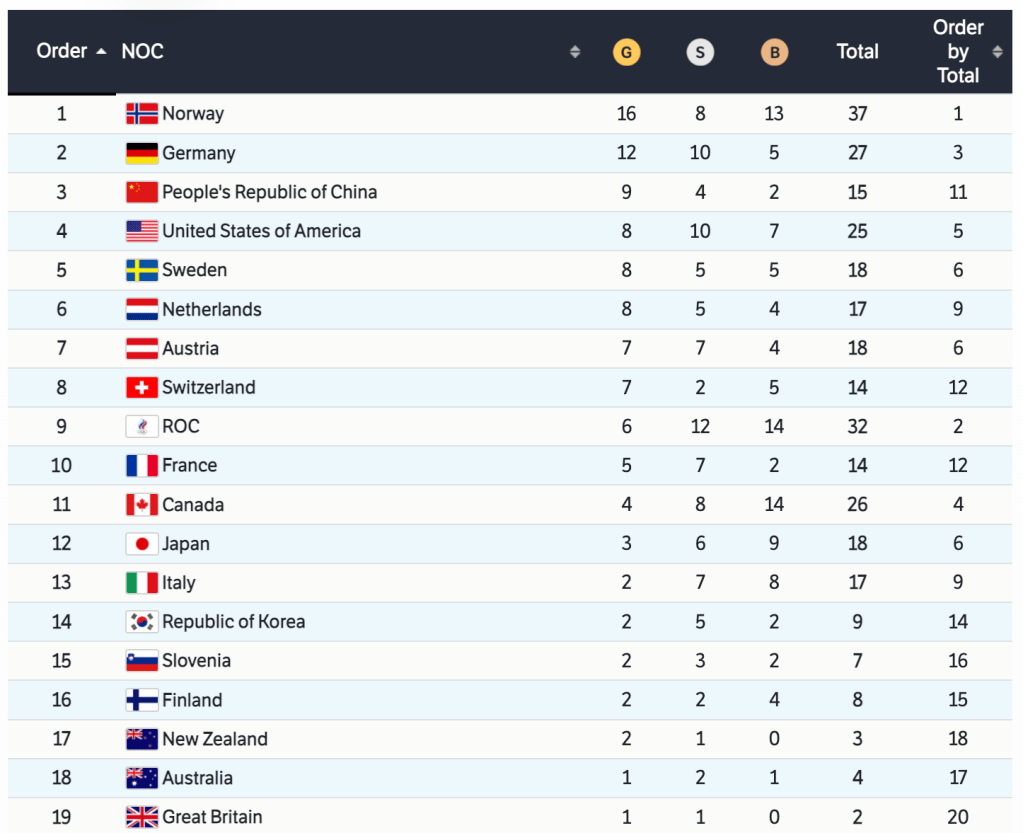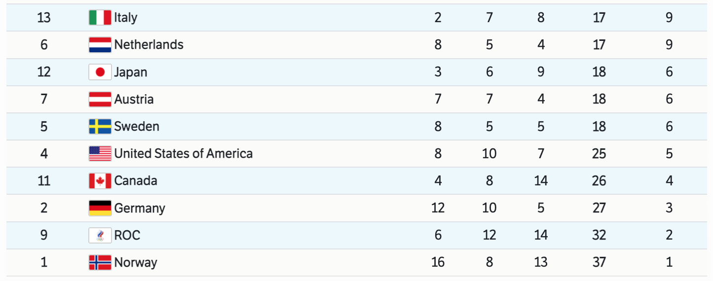 Norway won the medal count with 16 gold medals. Germany came in 2nd with 12 gold medals. China came in 3rd with 9 gold medals. The United States finished 4th with 8 gold medals. Canada finished in 11th with 4 gold medals.