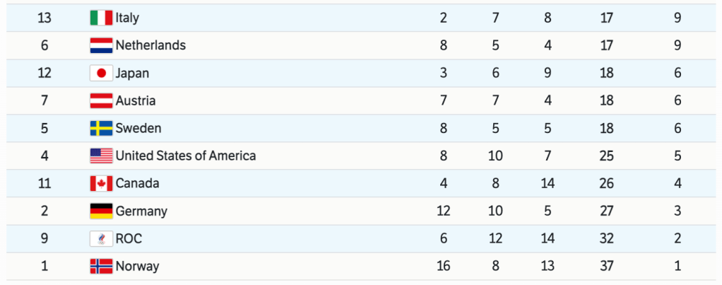 Norway won the overall medal count with 37 medals. ROC (Russia) came in 2nd with 32 medals. Germany came in 3rd with 27 medals. Canada came in 4th with 26 medals. The United States came in 5th with 25 medals.