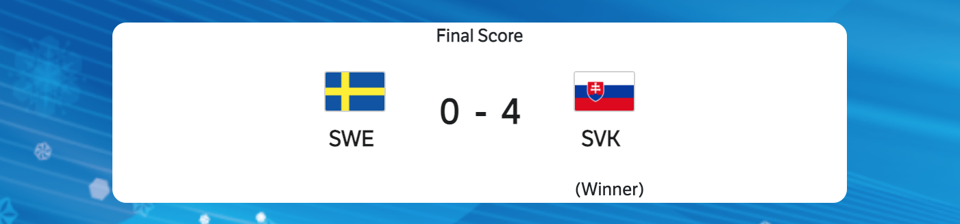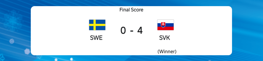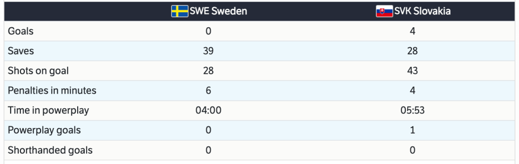 Bronze medal game. Sweden vs Slovakia. The score was 0-0 after the first period. Slovakia took a two goal lead in the second period. Slovakia then scored two more goals in the third period. The final score was 4-0 Slovakia.