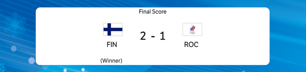 Finland wins gold. ROC (Russia) wins silver. A lot of people were happy that ROC (Russia) didn’t win. This is Finlands first ever Olympic gold medal in Ice Hockey. Prior to this Finland won silver twice and bronze four times.