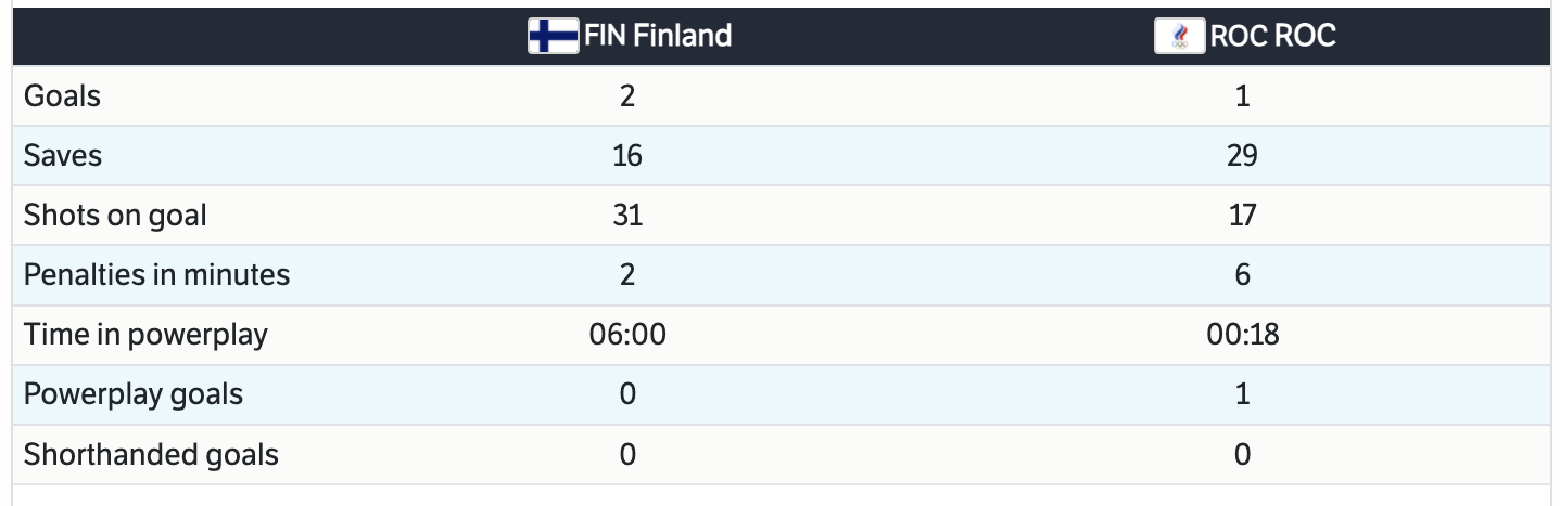 Finland scored less than 35 seconds into the third period to take the lead. ROC (Russia) would take a penalty for tripping 11 minutes into the period. Finland would not score on the powerplay. ROC (Russia) would pull their goalie with less than a minute to go. With less than 20 seconds left in the game a timeout was called. Finland would be able to hold on to their lead. The final score was 2-1 Finland.