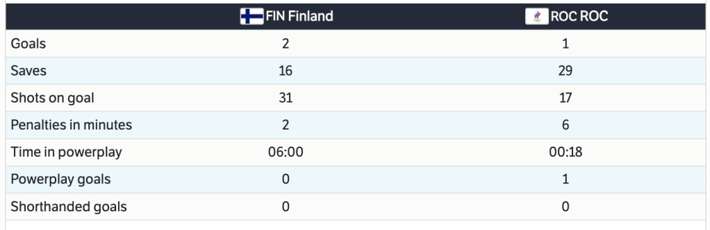 Finland took a penalty for high sticking 6 minutes into the game. ROC (Russia) would score less than 20 seconds into the powerplay. ROC (Russia) then took a penalty for cross-checking. Finland didn’t score on the powerplay. ROC (Russia) took a 1-0 lead into the second period.