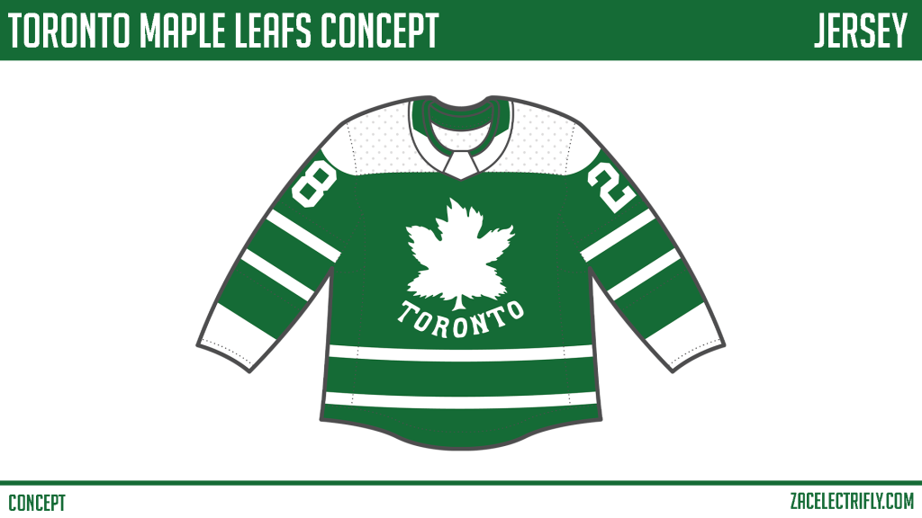 I took what The Buffalo Sabers did but for the Maple Leafs. The sabers basically took inspiration form their old jerseys to make a new one. I did that here with the Leafs jersey. I took the logo that they used in 1926/1927 as the main inspiration for this jersey. I then took the jersey they used from 1962 to 1967 (the last time the leafs were good) turned it green and added the old logo. After doing the jersey I realized that I should have added the Heritage Classic logo to the shoulder but oh well. Why green? When they were the St. Pats, and the first year they were the Maple Leafs, Toronto was green and white not the current blue and white. Plus I really like the logo.
