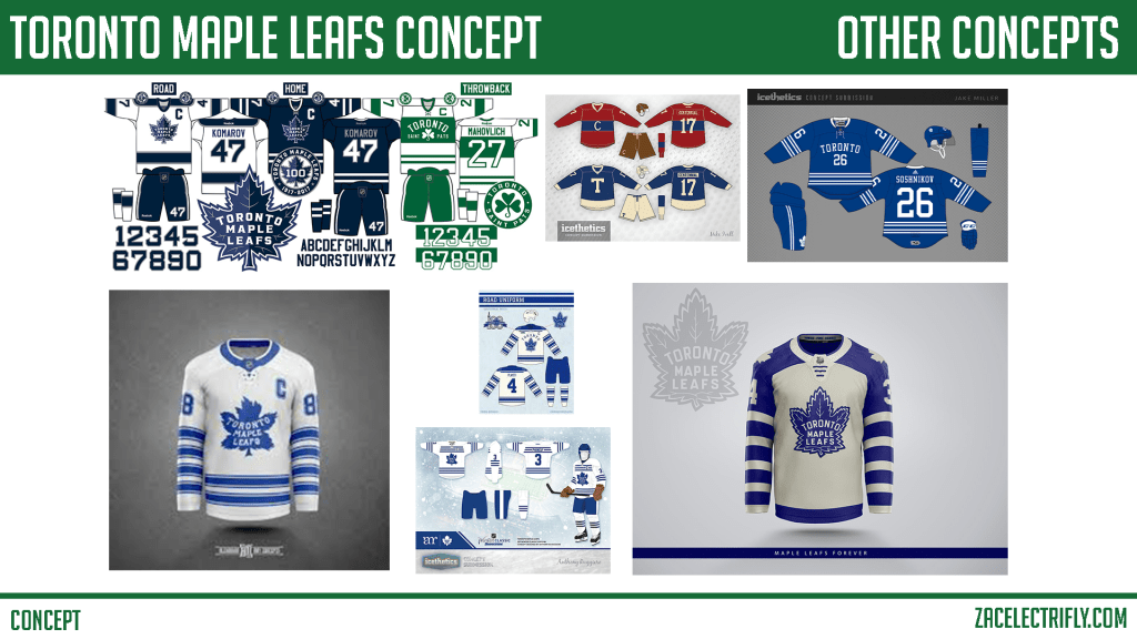 I didn’t do much else outside of the main concept. I knew what I wanted to do and did it. I did recolor the concept in blue. I also did the concept the now iconic Toronto Maple Leafs jersey pattern that was introduced in the1970’s and used until the 1990’s.