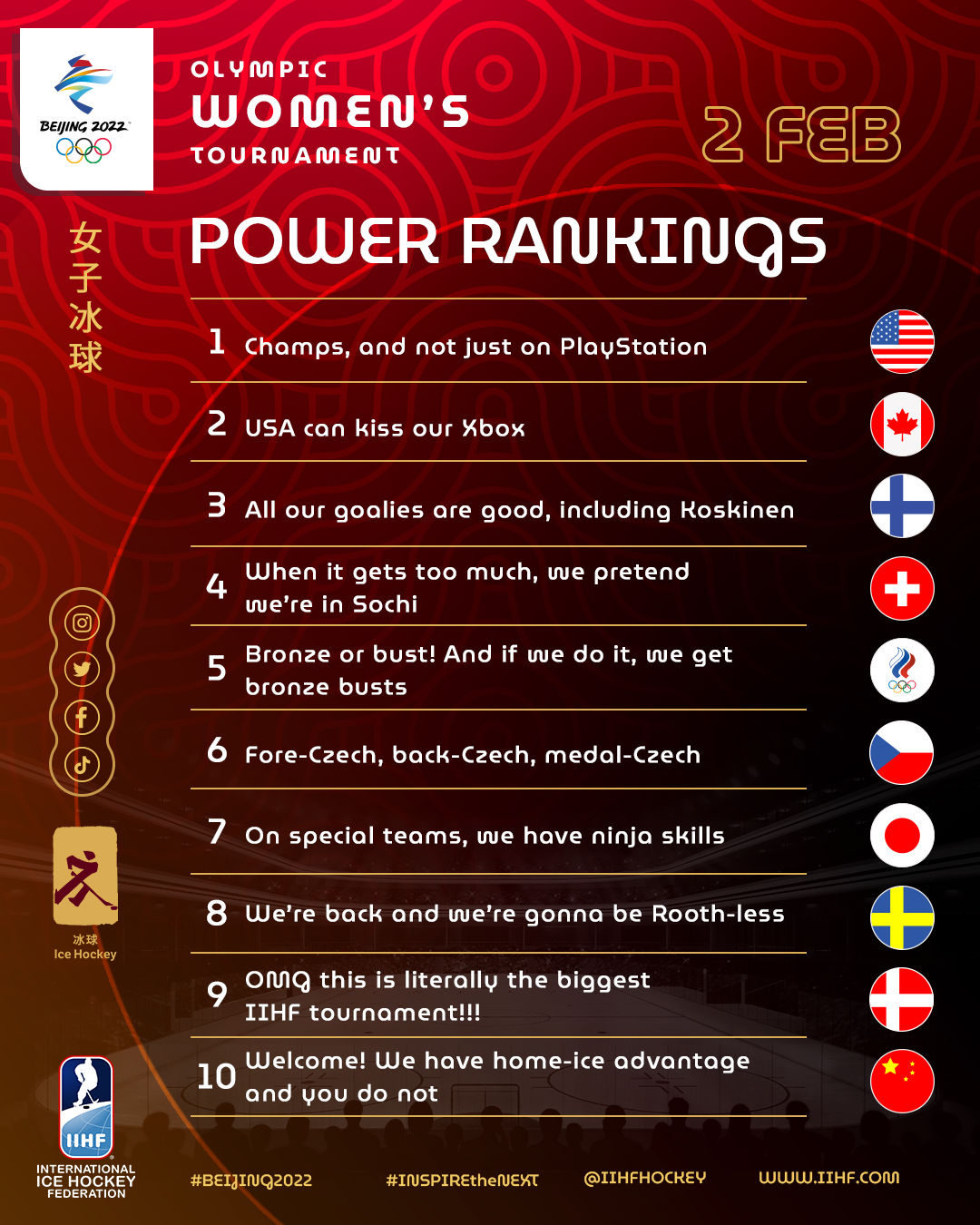 Heading into the tournament the United States and Canada were favored to win. No other team had been able to win gold in the Olympics. The United States and Canada are considered elite teams. No one else has been able to match their skill. Most other teams know coming into the Olympics that they are just there to compete for bronze. No other country has been able to match the United States and Canada. All eyes were on them heading into the tournament. The United States were defending gold medalists. They were number one in the power rankings. Canada was number two in the power rankings. Finland was number three. All the way at the bottom was China. Last in the power rankings, nothing was expected from China. China’s 2021 IIHF ranking was 20th out of 42. They wouldn’t be in this tournament if they weren’t hosting it.