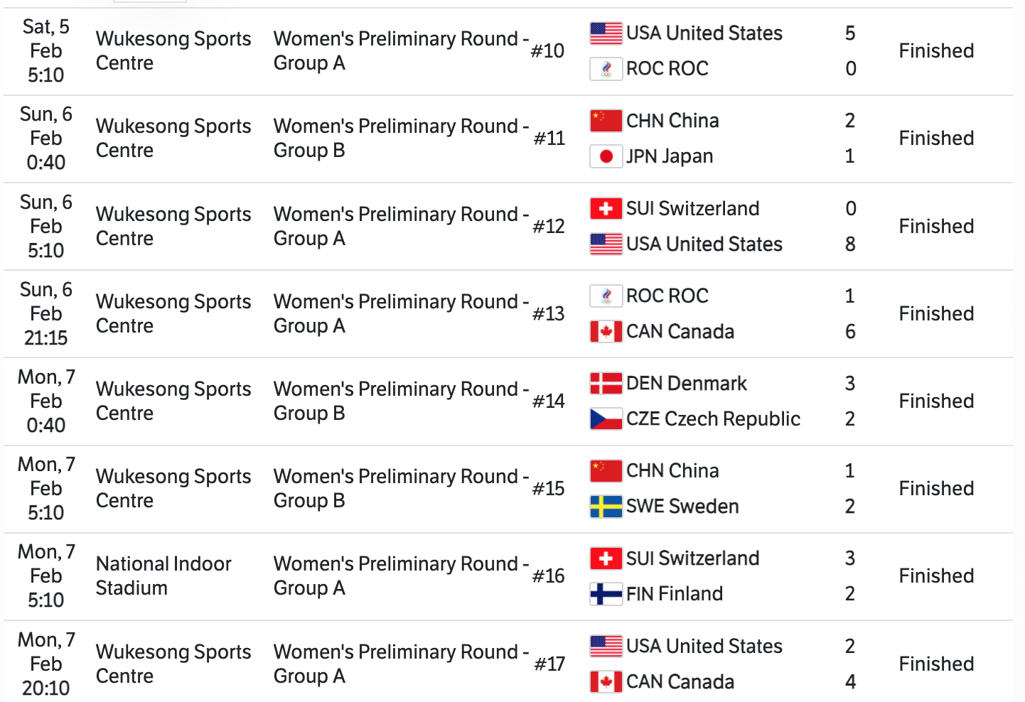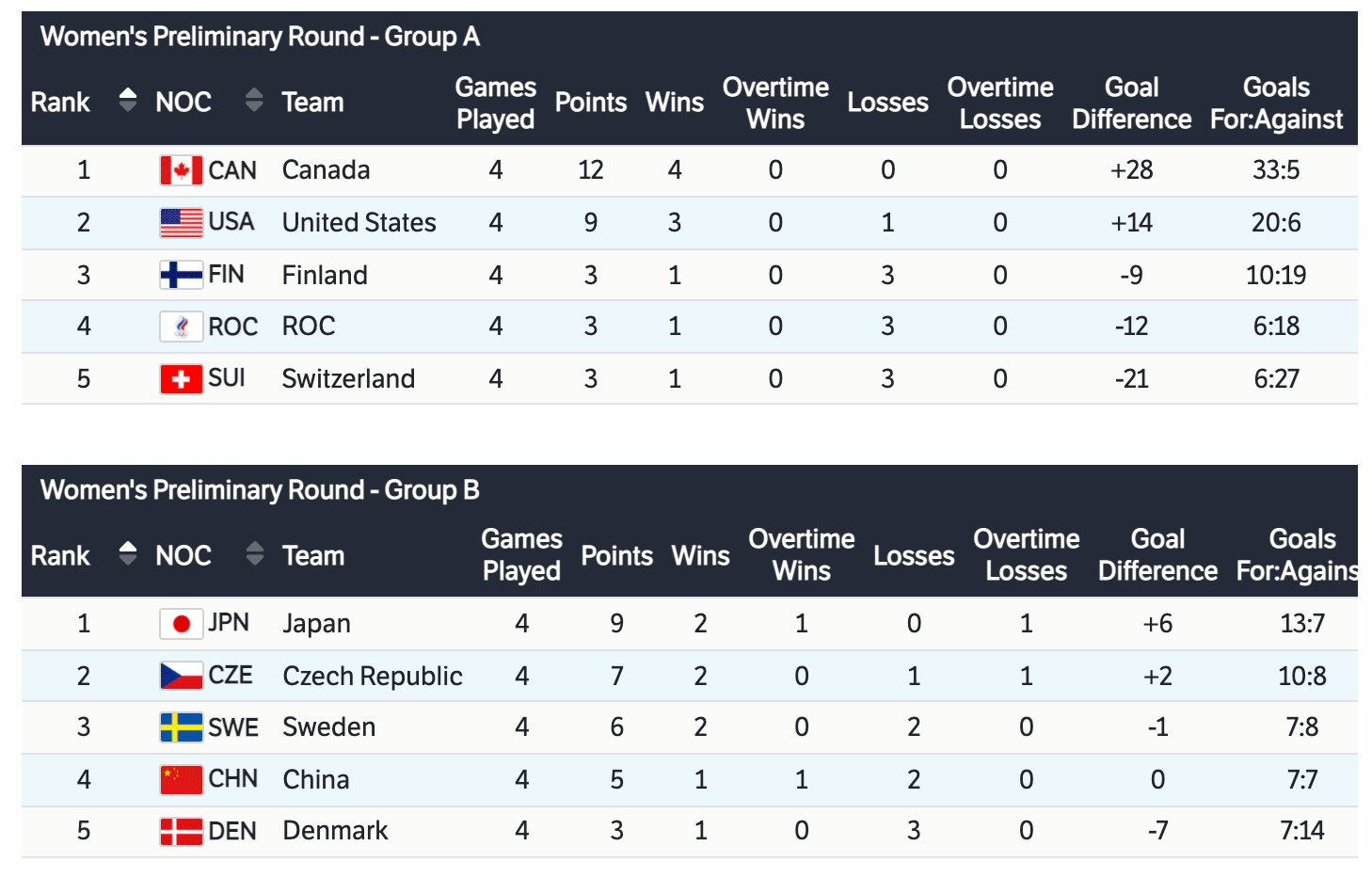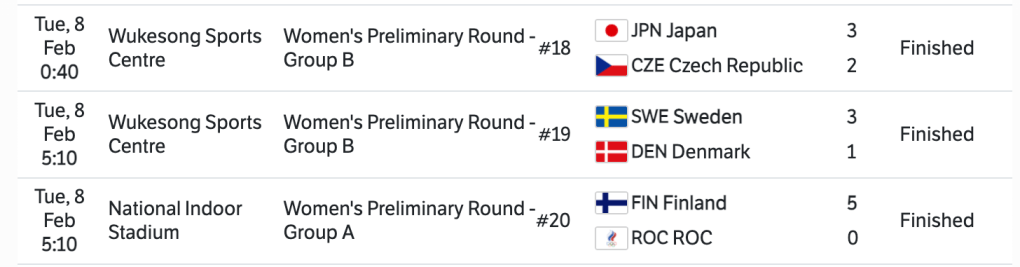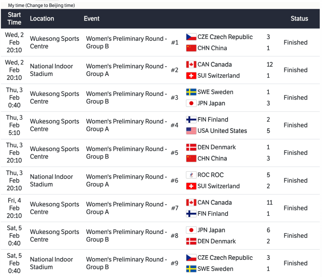 In this post I will be recapping the Women’s Ice Hockey tournament from the XXIV Olympic Winter Games. The format for this tournament was a ten team group stage followed by an elimination stage. Only the bottom two teams from Group B would be eliminated. The other eight teams would make it to the Quarterfinals. Group A consisted of Canada, Finland, ROC (Russia), Switzerland, and the United States. In Group B was China, Czech Republic, Denmark, Japan and Sweden.