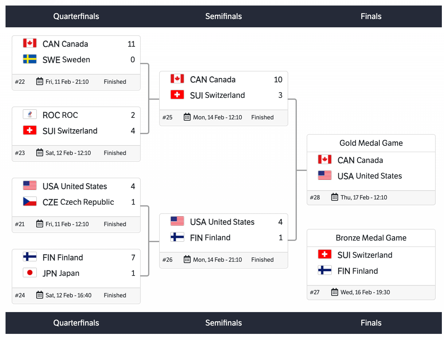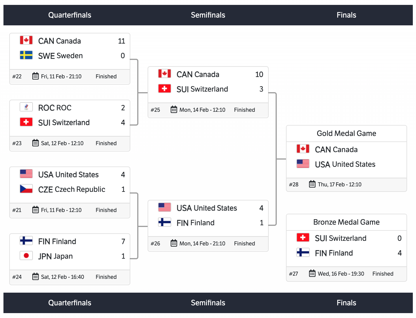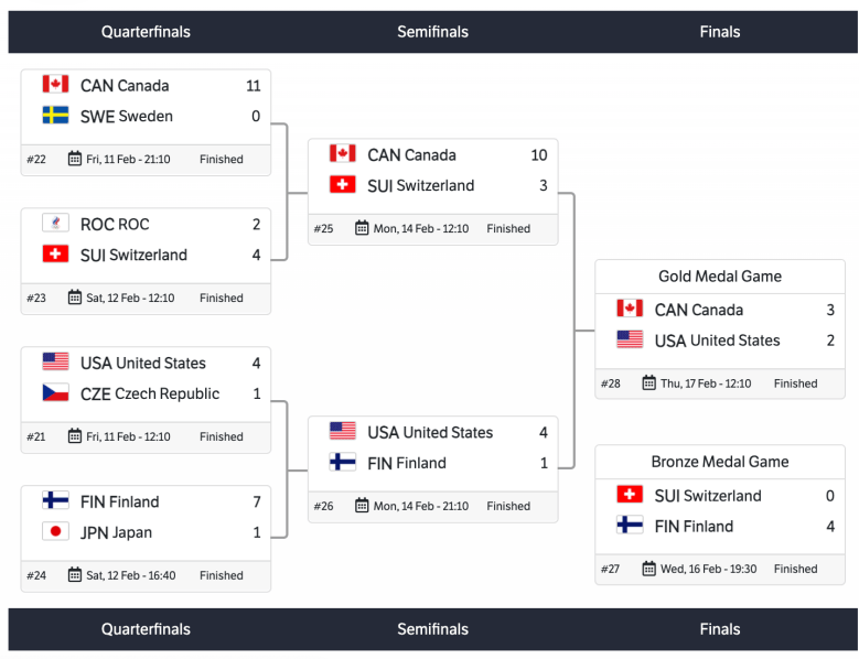In the Quarter finals, Canada defeated Sweden 11-0. That was Canadas only shutout of the tournament. Switzerland upset ROC (Russia) with a score of 4-2. The United States defeated the Czech Republic 4-1. Finland defeated Japan 7-1. Sweden, ROC (Russia), Czech Republic, and Japan were eliminated in the Quarterfinals.