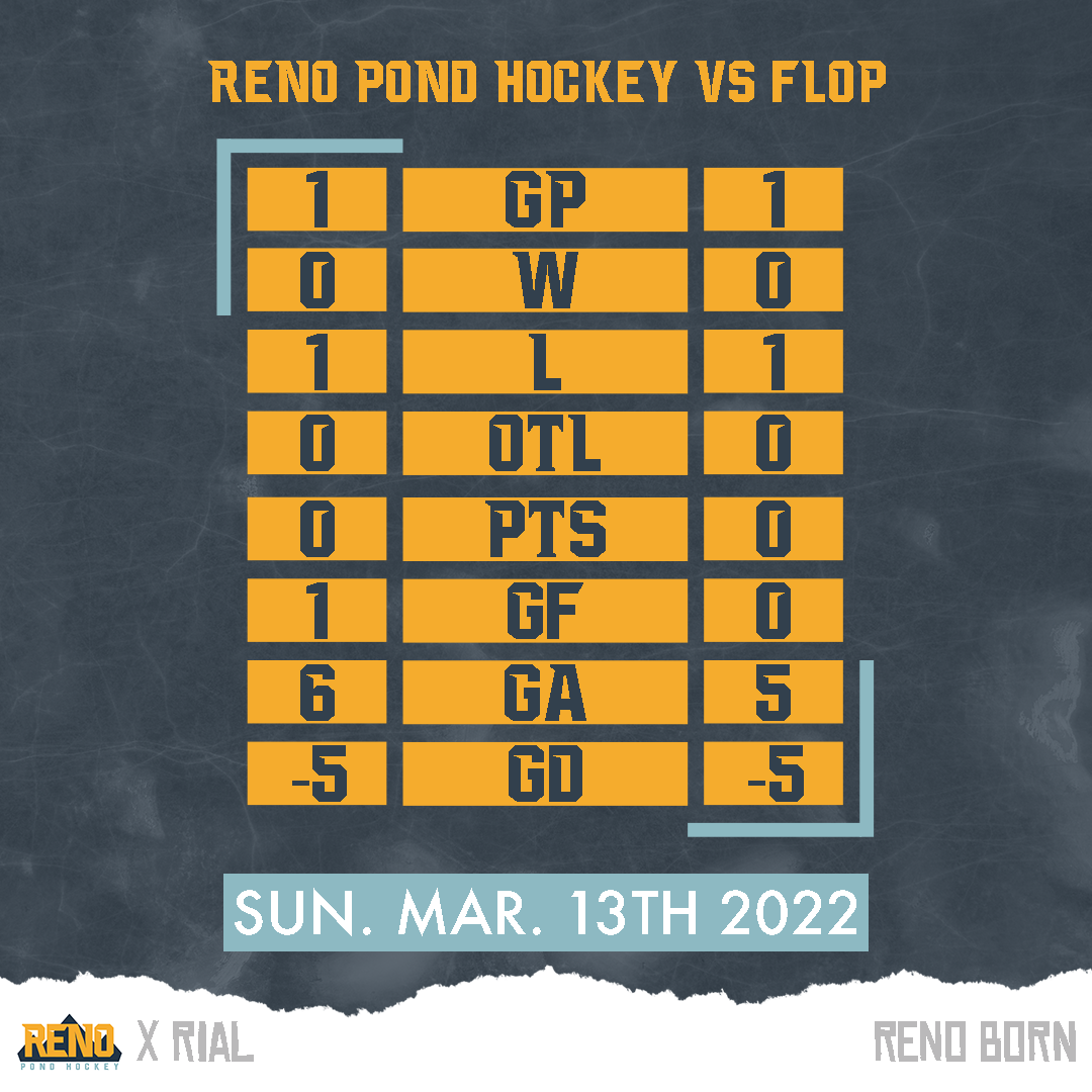 Reno Pond Hockey and Flop have both played one game. Neither team has won a game yet. Both teams have one loss. Neither team has lost in a shootout. Both teams have zero points. Reno Pond Hockey has more goals. Reno Pond Hockey has one more goal than Flop. Flop has allowed one less goal. both teams have a -5 goal differential.