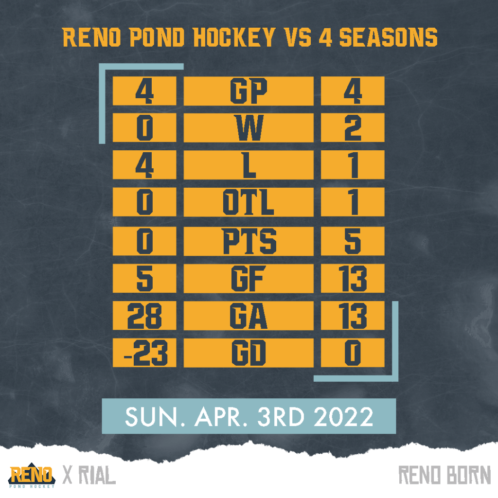 Both teams have played four games. 4 Seasons has two wins to Reno Pond Hockeys zero. Reno Pond Hockey has 4 losses while 4 Seasons has 1. 4 Seasons also has an overtime loss. Reno Pond Hockey has not had a game go into overtime. 4 Seasons has 5 points. Reno Pond Hockey has zero. Reno Pond Hockey has 5 goals while 4 Seasons has 13. Reno Pond Hockey has allowed 28 goals. 4 Seasons has allowed 13. Reno Pond Hockey has a goal differential of -23. 4 Seasons has a goal differential of 0.