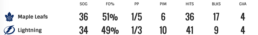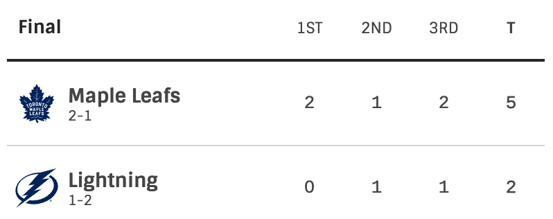 Toronto Maple Leafs vs Tampa Bay Lightning. Round one. Game three. In Tampa Bay. The Maple Leafs took a 2-0 lead in the first period. They made it 3-0 before the Lightning scored. The score was 3-1 heading into the third period. The Lightning would make it 3-2 before the Maple Leafs scored two more goals. The final score was 5-2 Maple Leafs. The Maple Leafs took a 2-1 series lead.
