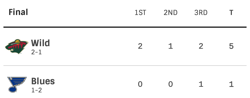 The Blues completely collapsed in this one. They had no answer to the Wilds offense until it was too late. Th question now is what will their offense do? Game 4 is on Sunday.