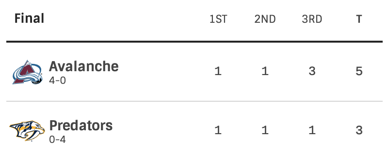 Colorado Avalanche vs Nashville Predators. Round one. Game four. In Nashville. the Avalanche had a 3-0 series lead going into this game. With a win they would close out this series and move onto round two. The Avalanche scored first less than 2 minutes into the game. The Predators would tie it up with less than 2 minutes left in the first period. After the first period the game was tied at 1-1. Both teams would score once in the second period. The score was tied at 2-2 heading into the third period. The third period would be the Predators last chance to stay alive in the playoffs. The Predators scored 4 minutes into the third period to take the lead. The Avalanche would score three unanswered goals to win the game. With a game four win the Colorado Avalanche have swept the Nashville Predators. The Predators are out of the playoffs. The Avalanche advance to round two.