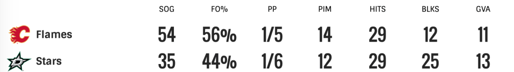 Calgary Flames vs Dallas Stars. Round one. Game four. In Dallas. The Stars had a 2-1 series lead going into the game. Neither team would score in the first period. The Flames would score a powerplay goal to take the lead. It was the only goal of the second period. The score was 1-0 Flames going into the third period. The Flames would add two more before the Stars scored. The Flames would get one more in the last 30 seconds of the game. The final score was 4-1 Flames. The series is now tied as it goes back to Calgary for game five. Game five will be tomorrow.