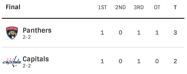 Florida Panthers vs Washington Capitals. Round one. Game Four. In Washington. The Capitals had a 2-1 series lead going into this game. The Capitals scored first on the powerplay. The Panthers would tie the game up before the end of the period. The score was 1-1 after the first period. Neither team scored in the second period. The Capitals took the lead midway theough the third period. The Panthers tied the game before the end of the period. The score was 2-2 after three periods. The game would head into overtime. The Panthers would score 5 minutes into overtime to win the game. The series is now tied at 2-2. The next game will be Wednesday in Florida.