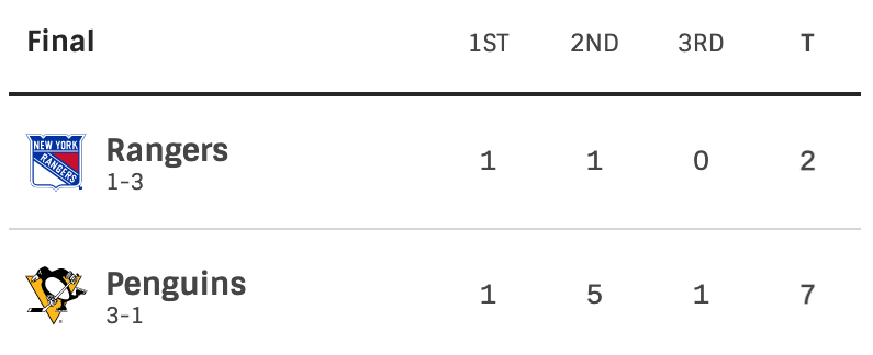 New York Rangers vs Pittsburgh Penguins. Round one. Game four. In Pittsburgh. The Penguins had a 2-1 series lead going into this game. The Rangers scored first. They scored two minutes into the game. The Penguins tied the game about half way through the first period. The score was tied at 1-1 after the first period. The Penguins broke the tie 3 minutes into the second period. Less than 30 seconds later they would add to their lead. The Penguins would score three unanswered goals before the rangers would score again. The Penguins would net two more goals at the end of the second period to make the score 6-2 Penguins. The Penguins would score one more goal in the third period. The final score was 7-2 Penguins. The Penguins now have a 3-1 series lead over the Rangers. Game five will be in New York on Wednesday. The Penguins will have a chance to close out the series with a win.