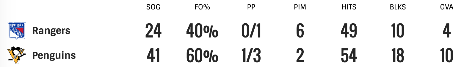 The Penguins massively outshot the Rangers. The Penguins win can be attributed to them not taking penalties, winning faceoffs, and taking shots. The Rangers were in this game in the beginning. Then they just let the Penguins take over. The Penguins really took over in the second period. The second and third Penguins goals as well as their fifth and sixth goals were within a minute of each other. The Penguins were scoring in bunches and quickly. All of the momentum is on the Penguins side as the series shifts back to New York. Will the Rangers have anything up their sleeves to stop the penguins?