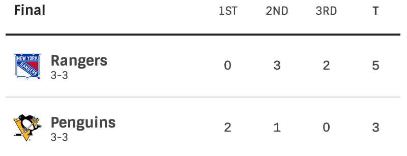 Pittsburgh Penguins vs New York Rangers. Round one. Game six. In Pittsburgh. The Penguins led the series 3-2 going into the game. No Sidney Crosby. With a win the Penguins could advance to round two. The Penguins took a 2-0 lead after the first period. The Rangers then scored three goals. The Penguins were able to tie it up before the end of the period. The score was 3-3 going into the third period. The Rangers took the lead late in the period. The Rangers got the empty net goal. The final score was 5-3 Rangers. The Rangers were able to force a game seven. Game seven will be tomorrow in New York.