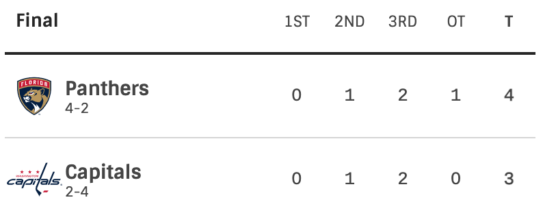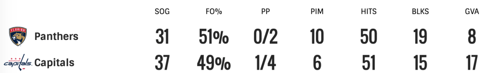 Washington Capitals vs Florida Panthers. Round one. Game six. In Washington. The series was 3-2 Panthers going into the game. With a win the Panthers would advance to the second round. Neither team scored in the first period. The Capitals would break the tie in the second period. The Panthers would tie the game back up before the end of the period. The score was 1-1 going into the third period. The Capitals would take the lead early in the third period. The Panthers would score two goals to get the lead. With 1 minute and 1 second to go, TJ Oshie scored for the Capitals to tie the game. That goal would send them to overtime. The Panthers would score less than 3 minutes into overtime. The final score 4-3 Panthers. With that the Panthers have eliminated the Capitals. The Panthers will be moving on to round two. They will either play the Lightning or Maple Leafs.