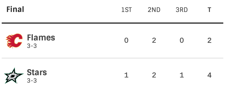 Dallas Stars vs Calgary Flames. Round one. Game six. In Dallas. The Flames led the series at 3-2 going into the game. With a win the Flames could advance to round two. The Stars took a 1-0 lead after the first period. The Stars would make it 2-0 before the Flames would score. The Flames would tie the game but the stars would take the lead before the end of the period. The score was 3-2 Stars going into the third period. The Stars would add one more goal to that total before the end of the period. The final score was 4-2 Stars. The Stars managed to force a game seven. Game seven will be in Calgary tomorrow.