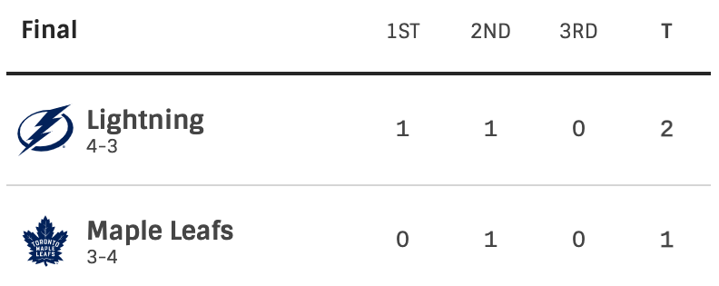 Tampa Bay Lightning vs Toronto Maple Leafs. Round one. Game seven. Winner moves on to round two. The Lightning took a 1-0 lead after the first period. The Maple Leafs tied the game in the second period. The Lightning would take the lead into the third period. No one scored in the third period. The final score was 2-1 Lightning. The Lightning won the series. They will be moving on to round two. The Maple Leafs have been eliminated from the playoffs.