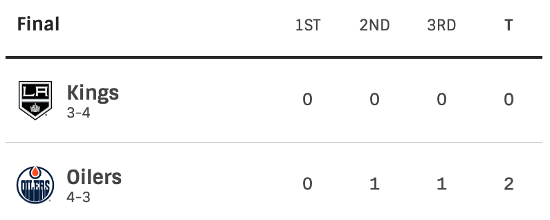 LA Kings vs Edmonton Oilers. Round one. Game seven. In Edmonton. Winner moves on to round two. No one scores in the first. The Oilers take the lead in the second period. Connor McDavid scored a beautiful goal off of an amazing solo effort to seal the Kings fate in the third. The final score was 2-0 Oilers. This was Mike Smiths second shutout of the series. This was the third shutout in the series. The Oilers will now face the Flames for a playoff edition of the battle of Alberta.