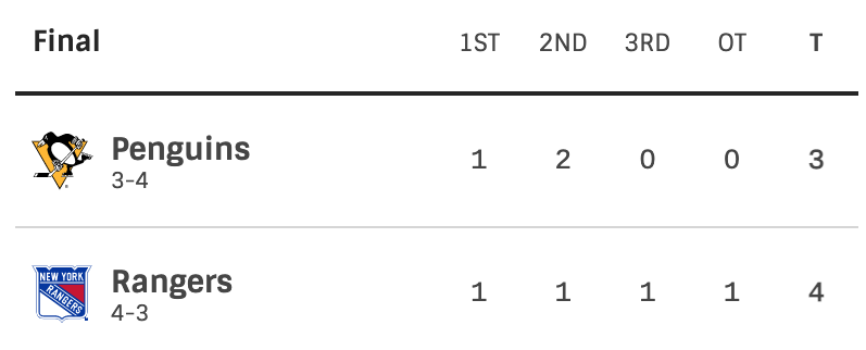 Pittsburgh Penguins vs New York Rangers. Round one. Game seven. In New York. Winner moves on to round two. Loser gets eliminated. The Rangers scored first. The Penguins tied the game before the end of the first period. The score was 1-1 after the first period. The Penguins took the lead on the powerplay. The Rangers tied it up. The Penguins took the lead again on a short handed goal. The score was 3-2 Penguins going into the third period. The Rangers would score the only goal of the third period which would lead to the game needing overtime. Game seven. Overtime. First team to score wins. The Rangers scored in Overtime on the powerplay. The Rangers won the game 4-3. The Rangers won the series. They will advance to round two.