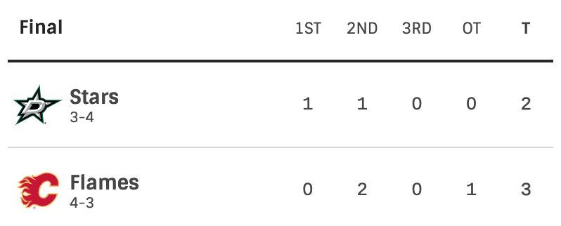 Dallas Stars vs Calgary Flames. Round one. Game seven. In Calgary. Same thing winner moves on, loser goes home. Dallas took a 1-0 lead after scoring 40 seconds into the game. The Flames would tie the game early in the second period. The Stars would take the lead again shortly after that. The Flames would tie the game before the end of the second period. No one scored in the third. Flames scored in overtime to win the game and the series. The Flames will be moving on to round two.