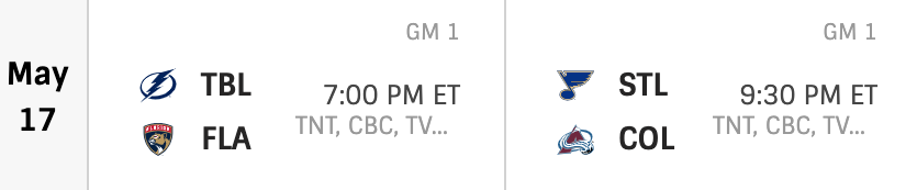 Game one is tonight in Florida. The Lightning beat the Maple leafs to get here. That was probably the best series in round one. The Panthers beat the Capitals to get here. I think it will be a good series. I think both teams have the potential to go all the way. I think round one prepared both teams for the challenges ahead. It should be a good series that could go to seven games.