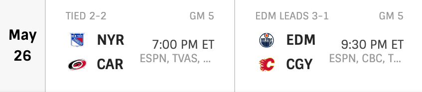 New York Rangers vs Carolina Hurricanes. The series is tied at 2-2. One of them will take the advantage today. Tonights Game could be the series deciding game. The 3-2 lead will be a huge advantage for either team.