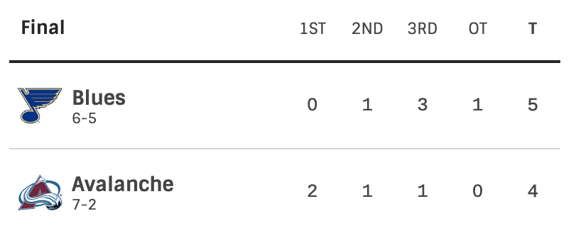 St Louis Blues vs Colorado Avalanche. Round two. Game Five. In Colorado. The Avalanche lead the series 3-1 going into the game. The Avalanche took a 2-0 lead after the first period. They mad it 3-0 before the Blues would score. The score was 3-1 Avalanche heading into the third period. The Blues would score twice to tie the game. The Avalanche would score to take the lead. The Blues scored in the final minute to tie the game. The game went to overtime. The Blues scored less than 4 minutes into overtime. The Final score was 5-4 Blues. The Avalanche still lead the series 3-2. Game six will be tomorrow in St Louis.