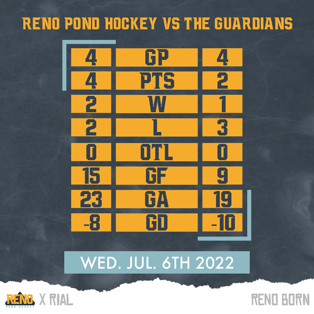 Reno Pond Hockey is coming off of a 3-8 loss to Mid-Ice Crisis. Reno Pond Hockey is 2-2-0. Reno Pond Hockey sits in 4th place in the current D-League standings. The Guardians are coming off of a 2-6 loss to the Grrrowlers. The Guardians are 1-3-0. Reno Pond Hockey has not played The Guardians yet.