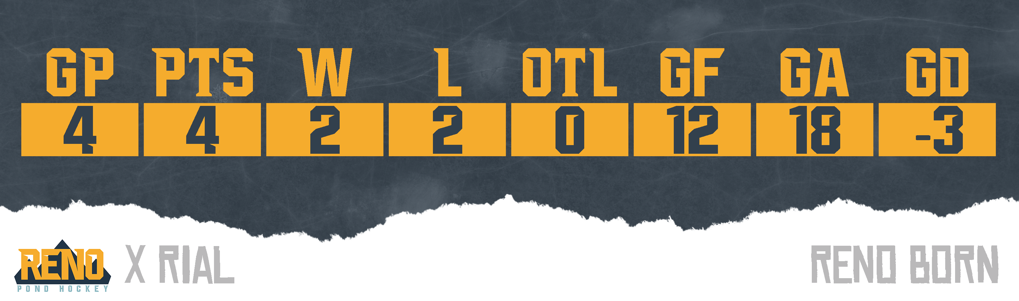 Reno Pond Hockey has allowed 23 goals after four games. That is 5.75 goals against per game. Reno Pond Hockey has a -8 goal differential.