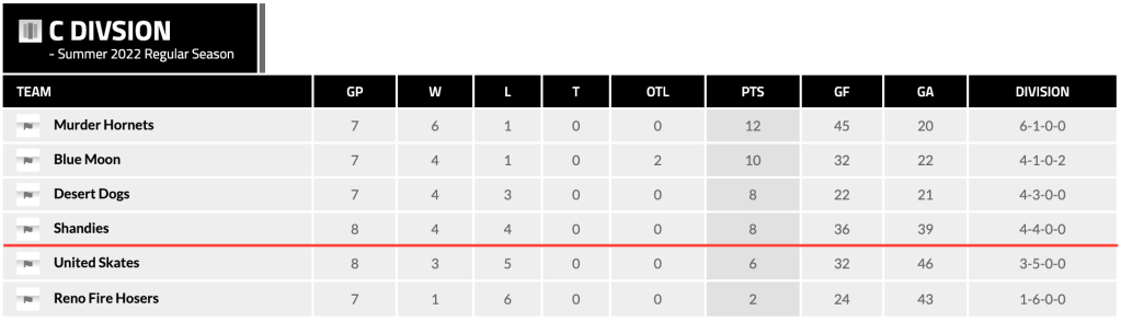 In C-League the Murder Hornets have secured their playoff spot. No one else has secured a spot yet. Blue Moon are only one point away from securing their spot. No one has been eliminated from playoff contention yet in C-League. Reno Fire Hosers are loss or shootout loss away from being eliminated from playoff contention. They would have to win all of their remaining games to make the playoffs. There are only four points separating second place from fifth place. With four to six points still up for grabs second through sixth place could all change.