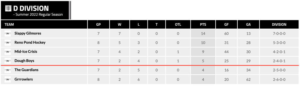In D-League the Slappy Gilmores have secured a playoff spot. No one else has secured their spot yet. Reno Pond Hockey is one point away from securing their spot. Mid-Ice Crisis is two points away from securing their spot. No one has been eliminated in D-League yet. Fourth through sixth place are only separated by one point. It is possible for second through fifth place to change completely.