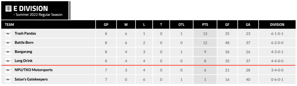In E-League Trash Pandas and Battle Born have secured playoff spots. Bangerang is only two points away from securing their playoff spot. All they need to do is win one game. Satans Gatekeepers have been eliminated. No one else has been eliminated yet. NPU/TKO Motorsports is still in the playoff race. With only three points separating third through fifth place, anyone of those teams could be eliminated or could be in the playoffs.