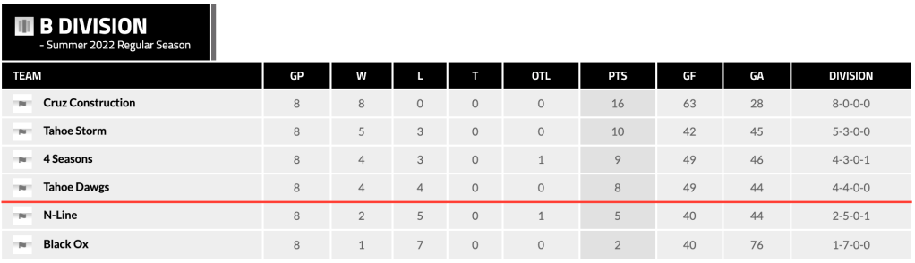 Tahoe Storm Are the only other B-League team to secure a playoff spot. Even though they don’t have 11 points they are too far ahead of 5th place to be eliminated. 4-Seasons and Tahoe Dawgs are on the edge of getting playoff spots. Black Ox have been eliminated from the playoffs. If Hyundai N-Line win the remainder of their games they may make the playoffs. If they lose even one game or a game goes into a shootout, they will be eliminated from playoff contention. If Hyundai N-Line are eliminated from playoff contention, 4 Seasons and Tahoe Dawgs will make the playoffs.