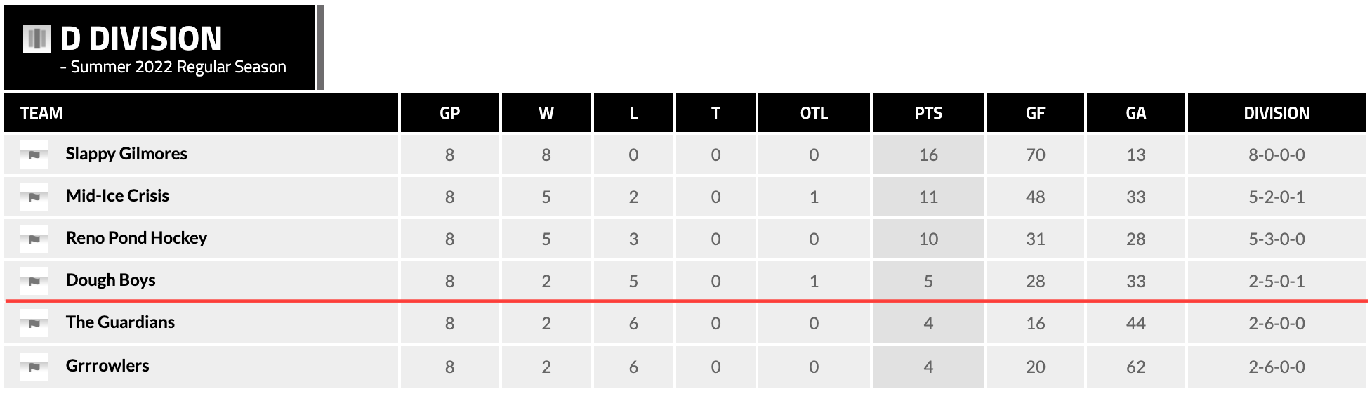 In D-League the Slappy Gilmores have secured a playoff spot. They have also secured the D-League regular season title and number one seed in the playoffs. Mid-Ice Crisis and Reno Pond Hockey have also secured their playoff spots. Reno Pond Hockey does not have eleven points yet but is too far ahead of fifth place to be eliminated. The second and third place semi-final matchup is already set between Mid-Ice Crisis and Reno Pond Hockey. At this point they are fighting over second place. None of the teams have been eliminated yet. Fourth though sixth place are fighting for that last playoff spot. There is only one point separating those three teams. If the Dough Boys win both remaining games they will make the playoffs. If the Guardians and Grrrowlers lose both remaining games the Dough Boys are in. If the Dough Boys lose both remaining games and the Guardians or Grrrowlers win one game they could be in the playoffs. There are a lot of scenarios here, but basically it’s a really close fight for that last playoff spot. One point or goal could decide if Dough Boys, Grrrowlers or Guardians make the playoffs. It could come down to the last game of the season.