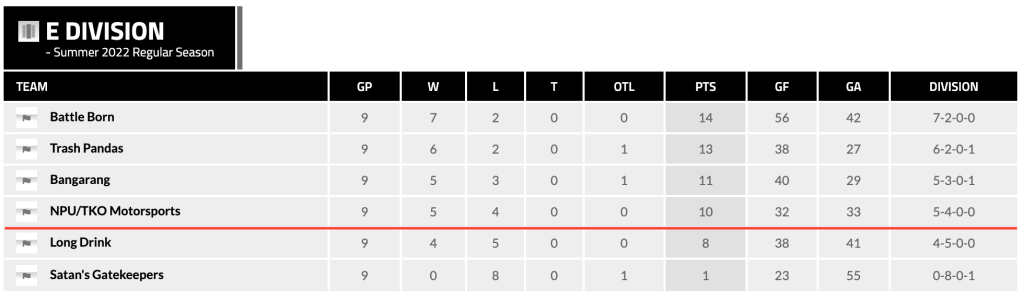 In E-League there is only one game remaining in the regular season. Trash Pandas, Battle Born and Bangarang have secured playoff spots. Satans Gatekeepers have been eliminated. Battle Born is currently leading the E-League standings. They have not secured first place yet. Trash Pandas are only one point away from tying Battle Born. Long Drink is only one win away from tying NPU/TKO Motorsports for the final playoff spot. Playoff seeding and the final E-League playoff spot is going to be decided by final games of the regular season.