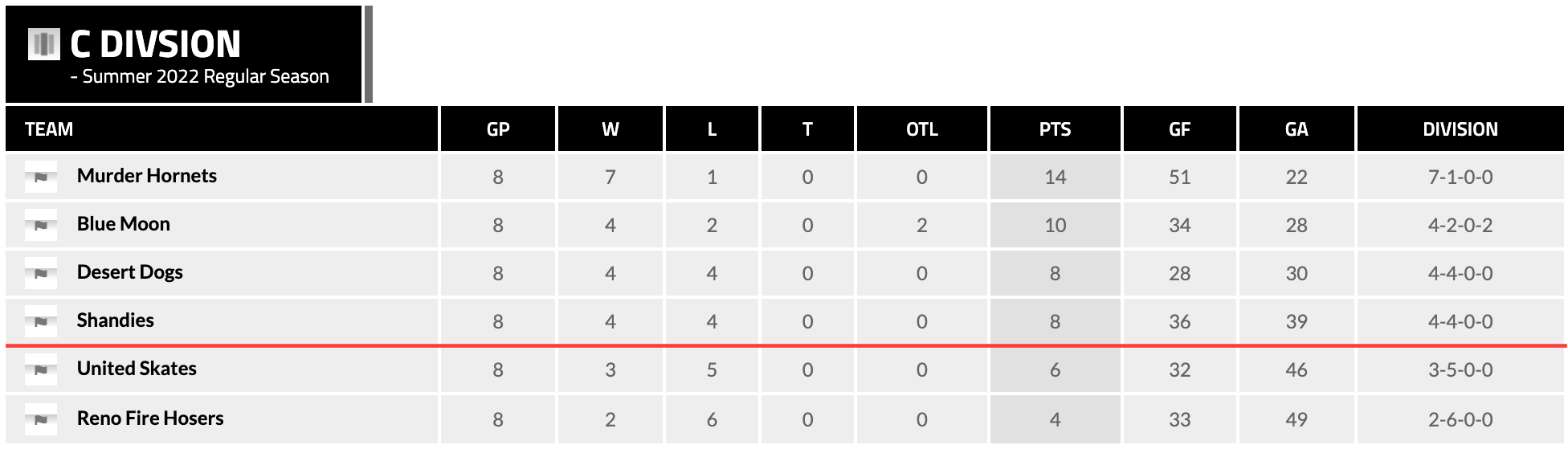 If Blue Moon wins one more game or loses in a shootout they will secure their playoff spot. The Desert Dogs and Shandies need to win at least one game and at least lose in a shootout. If they lose back to back shootouts one of them will make the playoffs the other might not. If they lose both games they may both not be in the playoffs. If the United Skates win both of their remaining games and Desert Dogs or Shandies lose one of their remaining games in regulation they could make the playoffs. If the Desert Dogs or Shandies lose both of their remaining games and the United Skates win one game they could make the playoffs. Basically the United Skates can’t lose both games, but if the Desert Dogs or Shandies get three points the United Skates will be out. The Reno Fire Hosers would have to win both of their remaining games with two of three teams (Desert Dogs, Shandies or United Skates) ending the season with eight or less points. If the Reno Fire Hosers win tie breakers they could make the playoffs. In that scenario their could be four teams tied with eight points but there would have to be at least two teams tied with eight points. Fourth place and fifth place would have to be tied with eight points. If the Reno Fire Hosers lose one of their two remaining games they will be eliminated from playoff contention.